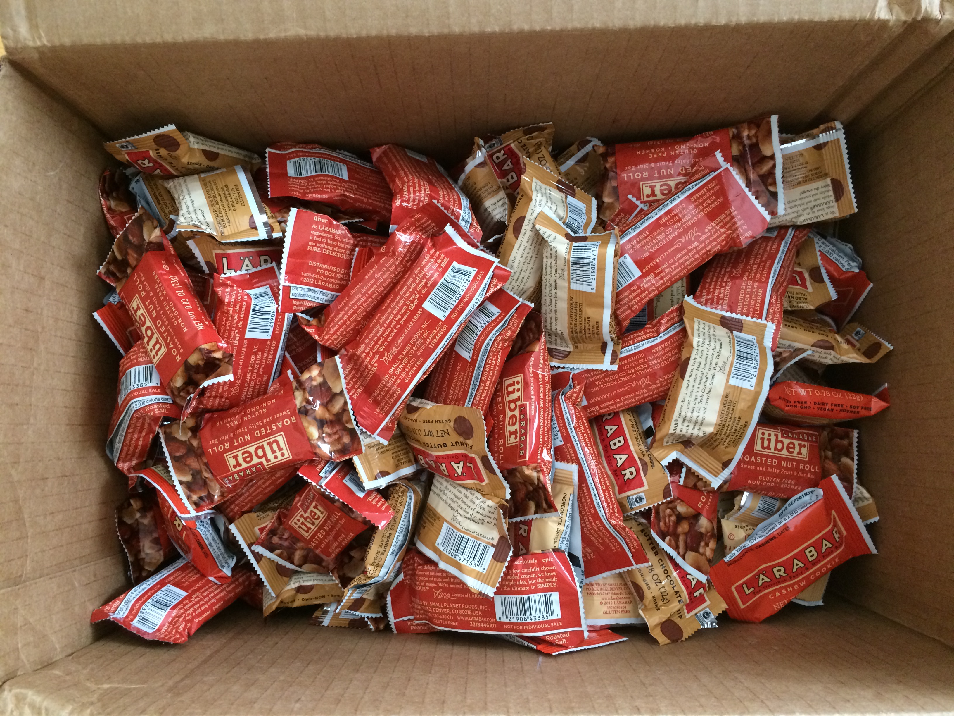 Holy Lärabar! Lärabar sent me a box full of mini bars as part of their Ambassador program. It’s like Halloween candy, but better for you. Fortunately, I love Larabars because there are 300 of them (at least according to the enclosed letter – fortunately, I am not OCD enough to count). As most of you know, my bowel/bladder issues mean I am very particular about what I eat when I am outside (e.g. climbing, skiing, whatever) for long periods of time without ready access to a bathroom. These are one of the few bars that are agreeable with my faulty plumbing and that I like the taste of. So, I am really glad to have a few to nosh on for myself and keep me fueled; and spread the love and give these out to folks.