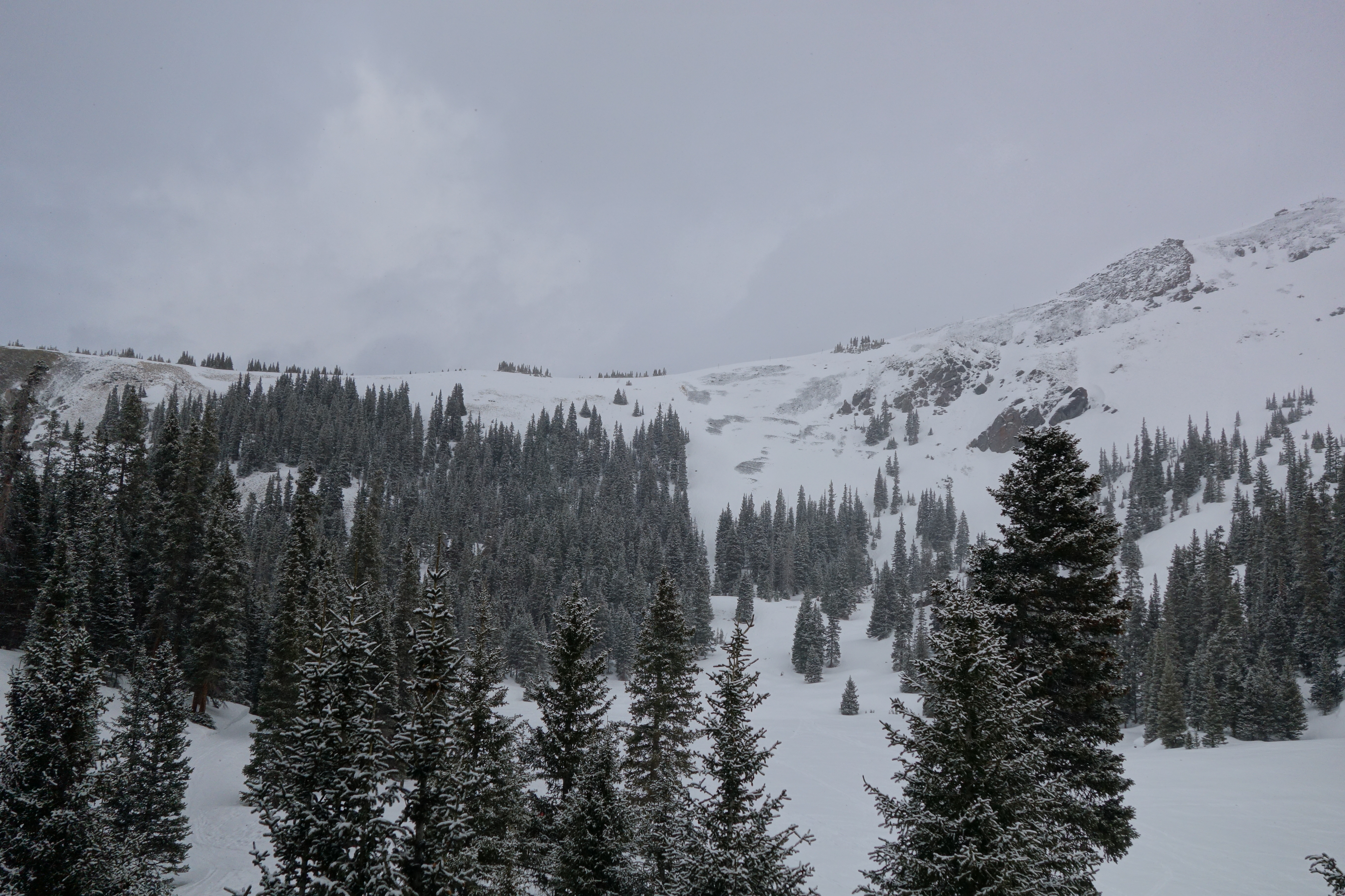 Conditions were very friendly: warm, low wind, firm snow underneath dust. The drop into the lakes was fine on one ski, despite lots of trees and shitty ice.