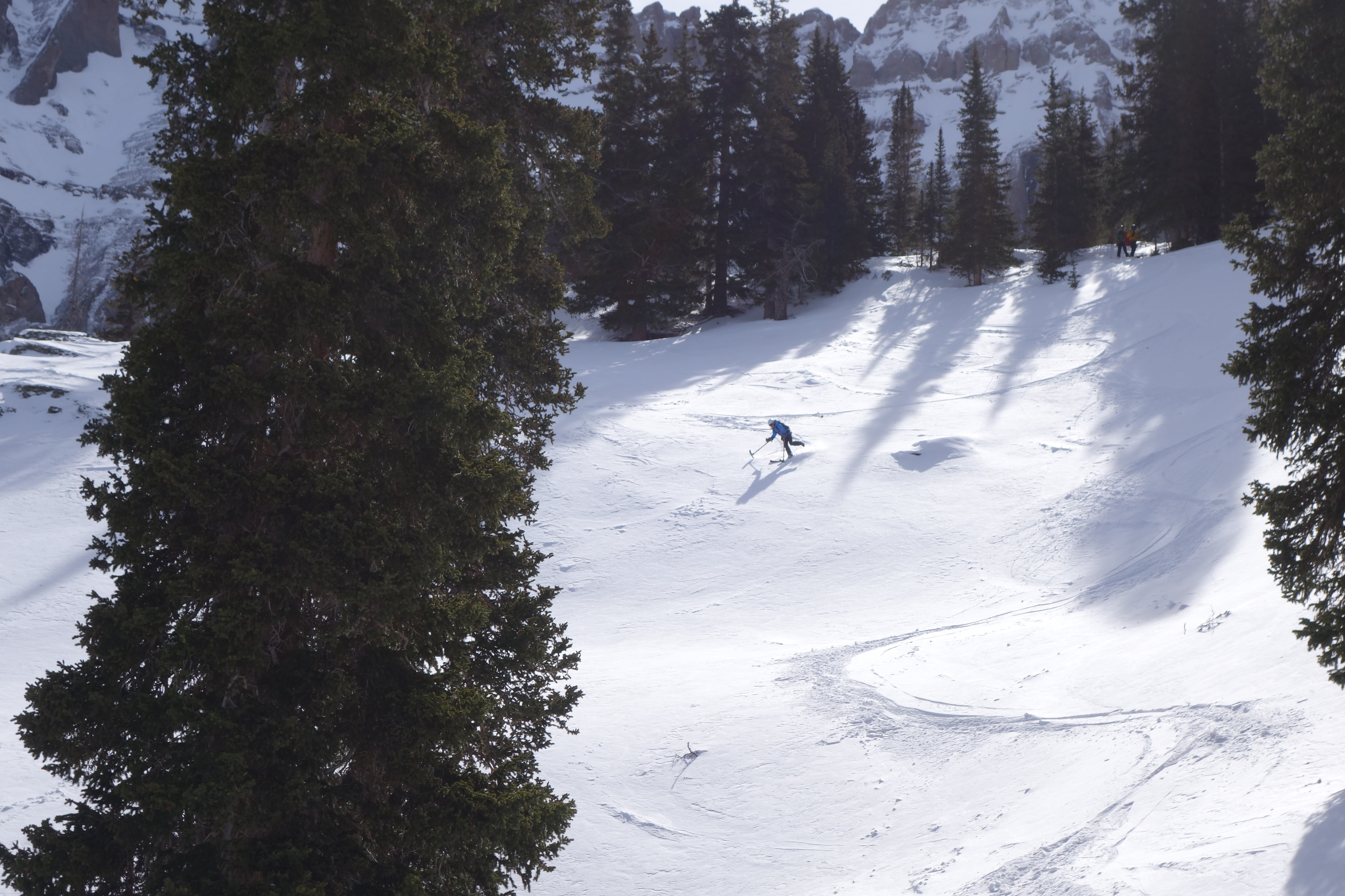 The snowshoe up to our runs was very tiring for me though. Firm snow is definitely easier than deeper snow, and we experienced it all over the weekend. We could not have had better guides than Joshua Butson and his guiding company, San Juan Outdoor Adventures, who was extremely skilled, knowledgeable, fun and patient. Joshua, btw, has done some pretty awesome first ascents all over the world.