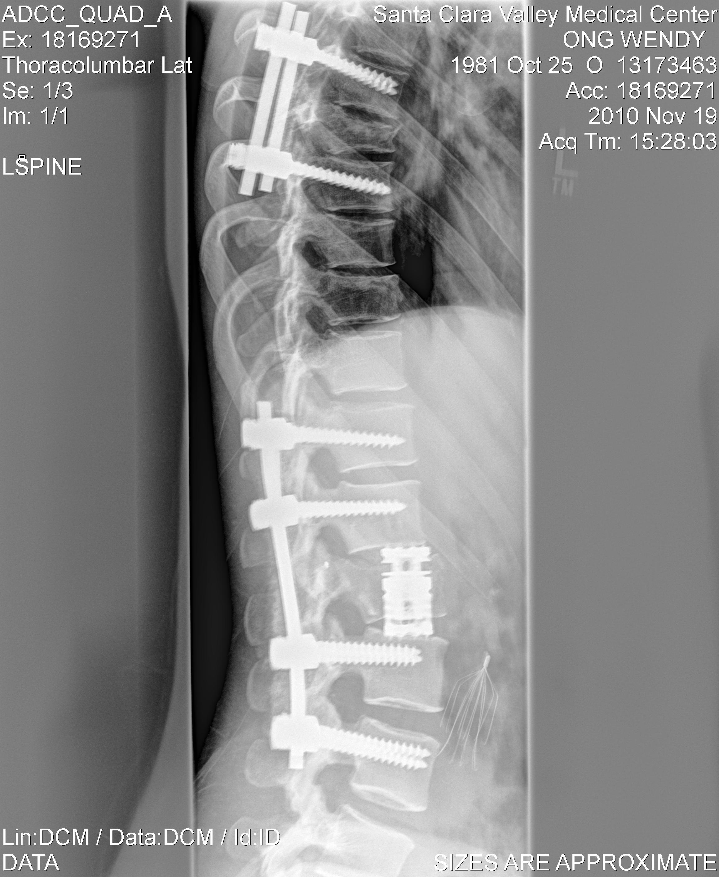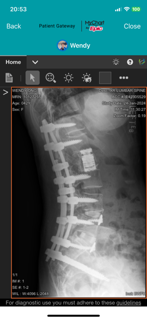 (2024 Update): After my December 26, 2023 surgery to extend my fusion from L4 to S1, and redo my T11 to L4 instrumentation, my lumbar region now looks like this.