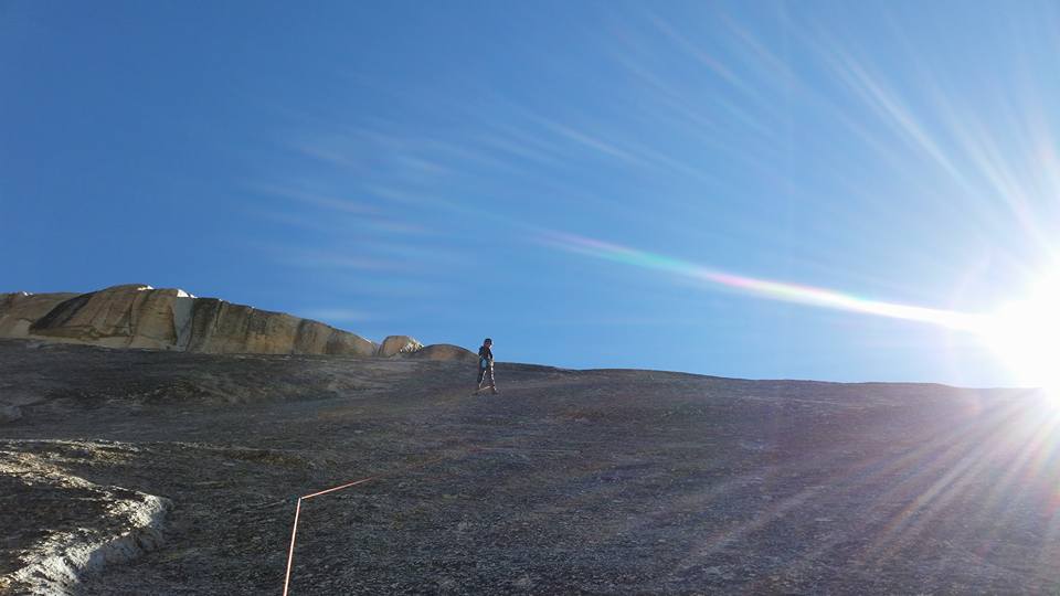 I still feel a bit bad that our choice of climbs was limited by the length/kind of approaches. So what do two climbers – one who dislikes slab climbing and one who used to like slab but can’t trust one of her feet/legs now – do? Find some runout slab climbing. We headed to Pywiak Dome, where both of us (especially me) were pushed out of our comfort zone.