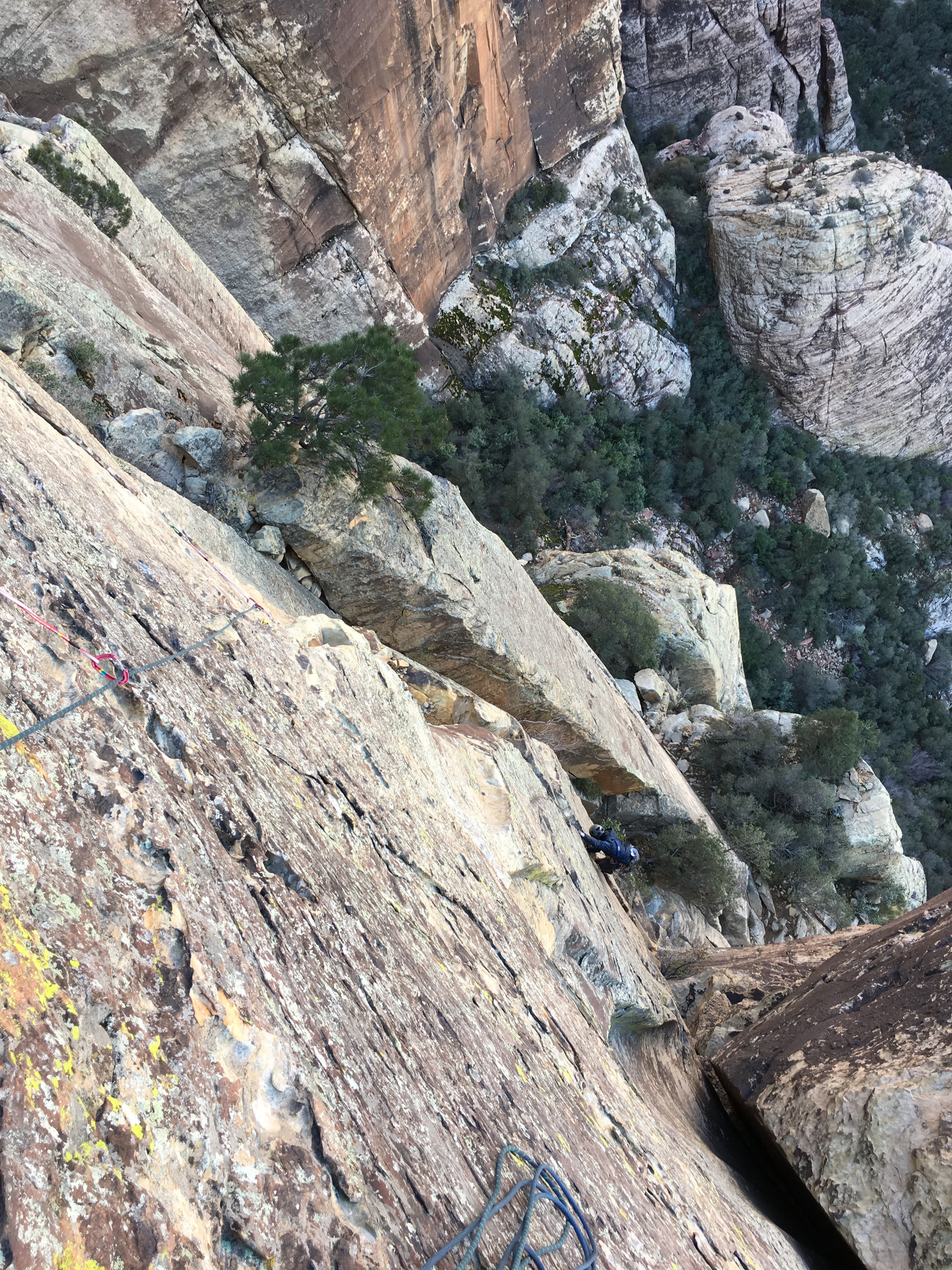 Zero gear, zero bolts to the anchors, ~135 ft above. First pitch, so a fall would have been a ground fall, and Chris was not anchored. Chris’ expression says it all. I was very very glad to reach the anchors.