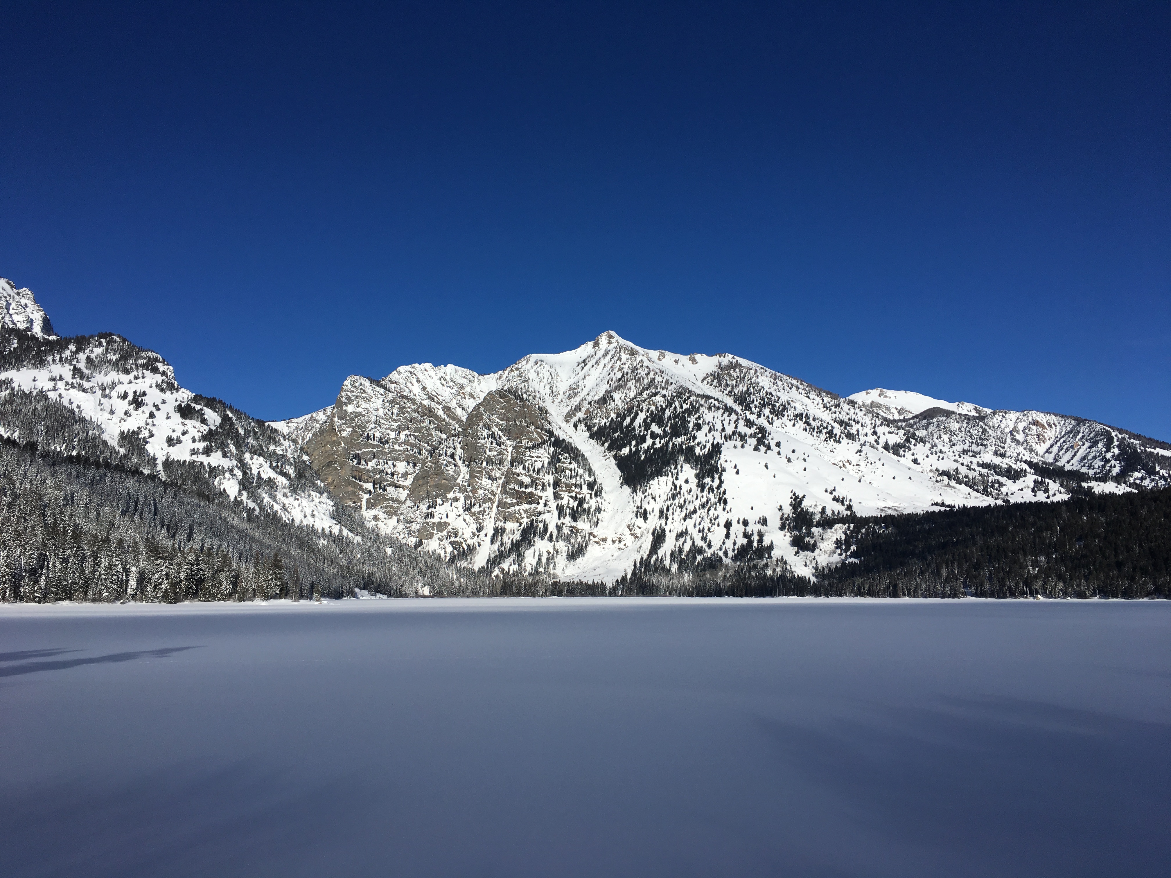 While I waited for my cortisone shot from yesterday to take effect and test skiing out tomorrow (Sunday), I decided to check out the Granite Canyon Trailhead area near Moose, WY, also within the Grand Teton National Park. Like Thursday’s snowshoe, the plowed road ends and you can snowshoe or cross-country ski in. I picked this starting point because it was not a long drive from me, but also known for being very quiet. Indeed, I had the entire place to myself and did not encounter a single person on my snowshoe to Phelps Lake. The only downside to such a quiet location was that I found myself having to break trail a lot of the way, but this was a good way to stay warm on this cold day. The temperature at the start of my snowshoe was -15 degF (-26 degC)and when I returned a few hours later, it was still negative Fahrenheit (-18 degC). I probably seem like a cold weather wimp, but I actually have no problems with these kinds of temperatures when the humidity is low.