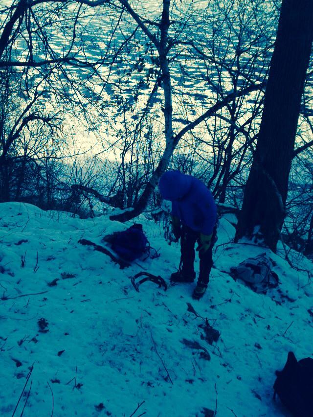 Sunday was a totally different story. Temperatures were in the low single digits (Farenheit), with wind-chills bringing perceived temperature into the negative range, and the temperatures only dropped (and wind picked up) as the day progressed. The climbing area for Sunday was also farther than Saturday’s, and I was very very slow plodding uphill. My gait degrades significantly when I am wearing heavy boots, so the combination of those, fresh snow, carrying a heavier pack with more clothing and gear (pro) made it a pretty miserable experience for me. I got on some steep W5 pillars, but soon lost feeling of my hands and just couldn’t place my tools properly. I completely shut down when I am freezing cold, and I was miserable to the point of tears. One challenge with staying warm is that because I am worried about having a bowel/bladder accident, I do not drink or eat much when I am climbing outside to try and boost my metabolism. This is especially important when ice-climbing; continually sipping a hot drink is so effective, yet I am/was so worried about peeing in my pants that I only took little sips of the hot chocolate in my thermos, and that was not enough to keep me from becoming cold enough to the point of being non-functional. It bums me out that I might only be a fair-weathered ice-climber, and that some options may be eliminated for me because of my plumbing defects. But I am trying not to be too discouraged and find encouragement in knowing that being pushed out of your comfort zone is, generally, a good thing (I think).
